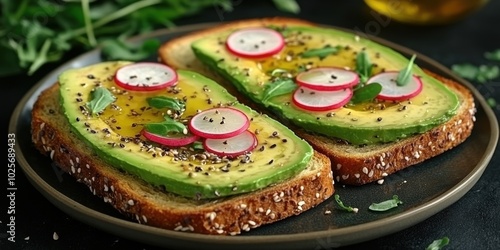 © Bang AI, Fototapeta premium Aesthetic avocado toast topped with radishes and herbs on a plate.
