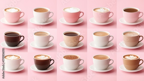 Fototapeta premium Aesthetic Collection of Coffee Cups in Various Colors and Designs on Soft Pink Background