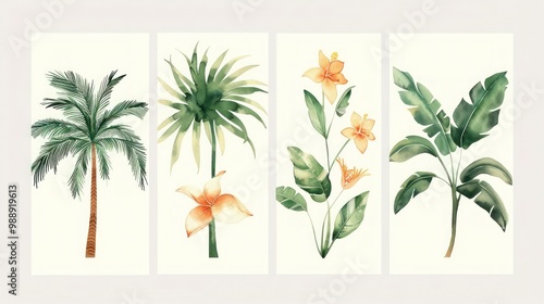Obraz premium Aesthetic 4-pack wall art collection with delicate watercolor illustrations of palm trees, banana plants, monstera leaves, and a tropical flower.