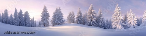 © Snowstudio, Fototapeta premium aesthetic photo of pine trees covered in snow, a pale pink sky, a panoramic view