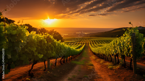 Fototapeta premium Aesthetically Captivating Vineyard: The Majestic Domain of Grapevines Under the Warm Hues of the Setting Sun