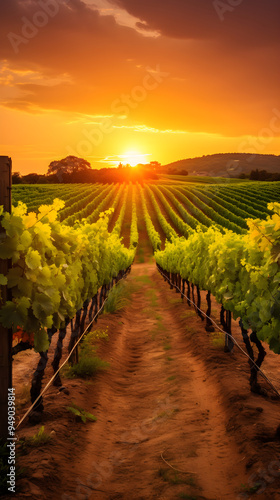 Fototapeta premium Aesthetically Captivating Vineyard: The Majestic Domain of Grapevines Under the Warm Hues of the Setting Sun