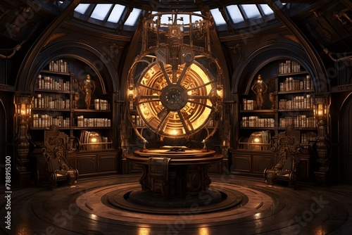 Obraz premium Aether Flux Sculptures and Baroque Bookcases: Steampunk Home Library Concepts with Amber Lighting