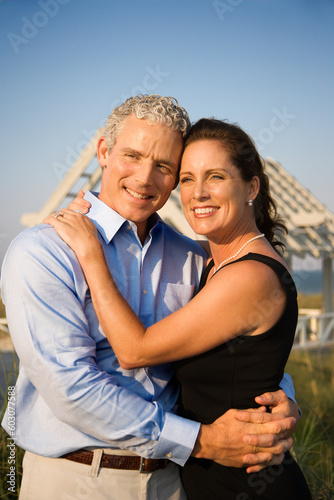 © Designpics, Obraz premium Affectionate couple on beach with their arms around one another. Vertical shot.