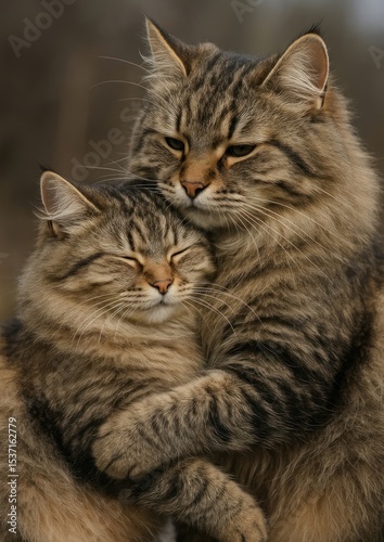 Obraz premium Affectionate fluffy cats cuddling outdoors.