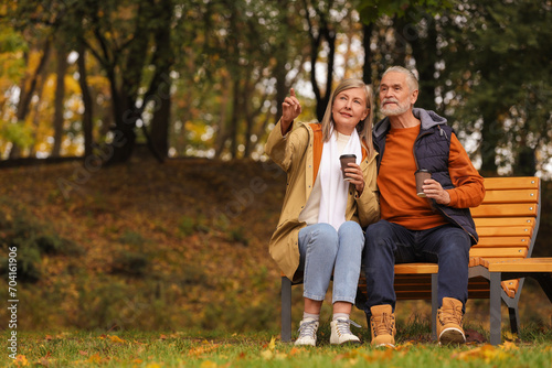 © New Africa, Fototapeta premium Affectionate senior couple with cups of coffee on wooden bench in autumn park, space for text