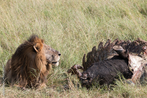 © Emily_M_Wilson, Fototapeta premium Africa, Kenya, Masai Mara National Reserve. African Lion (Panthera leo) males eating carrion of (Connochaetes taurinus), wildebeest. 2016-08-04