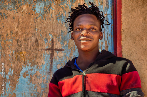 © poco_bw, Fototapeta premium africa village, african smiling single young man with dreadlocks braids , in front of the house in the yard, blue door,
