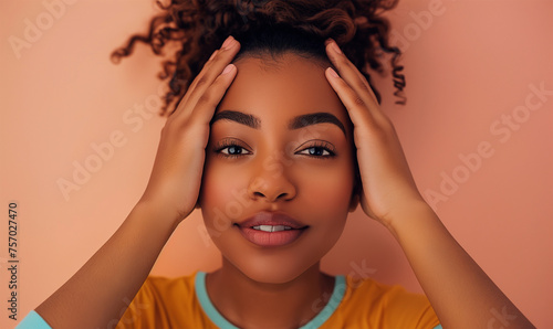 Fototapeta premium African American Black Woman Holding Hands on Forehead in Studio Setting...