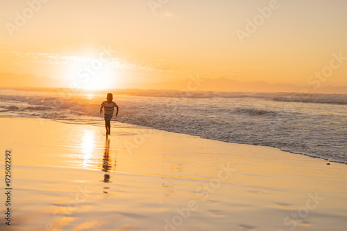 Fototapeta premium African American boy running at sunset on wet beach sand, waves lapping and...