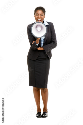 © AILA_IMAGES, Fototapeta premium African American business woman holding megaphone isolated on wh