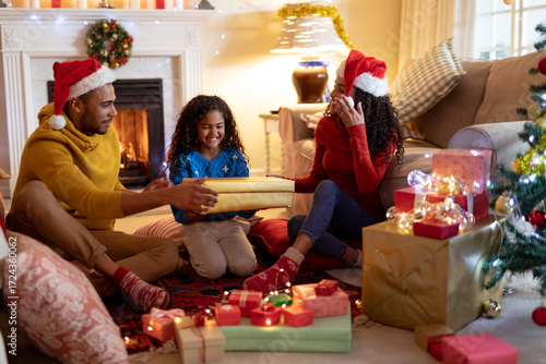 Fototapeta premium African American family in Santa hats exchanging gifts on rug in living room...