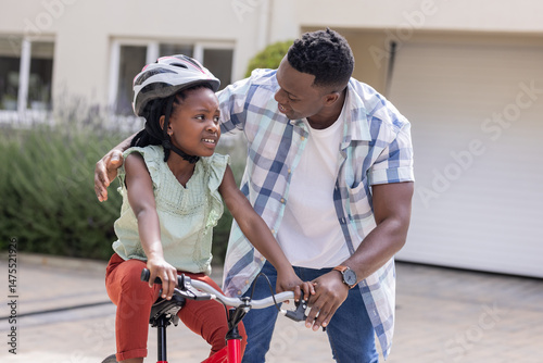 Fototapeta premium African American father teaching daughter to ride bicycle, both smiling outdoors
