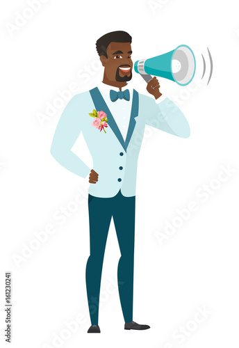 © Visual Generation, Fototapeta premium African-american groom talking into loudspeaker.