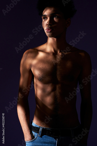 © Kostiantyn, Fototapeta premium African american male in shadow standing in studio with purple background verticale portrait shot