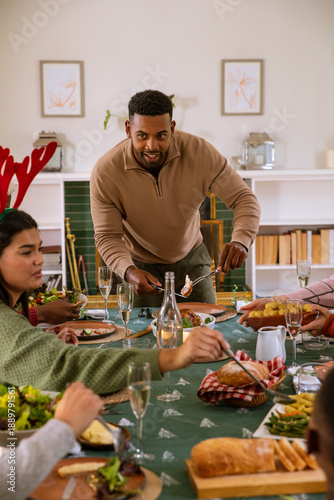 Fototapeta premium African american man carving roasted bird with knife and fork in home dining...