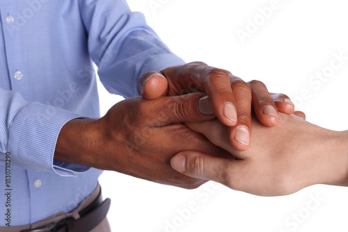 Fototapeta premium African-american man holding hands with woman on white background, closeup