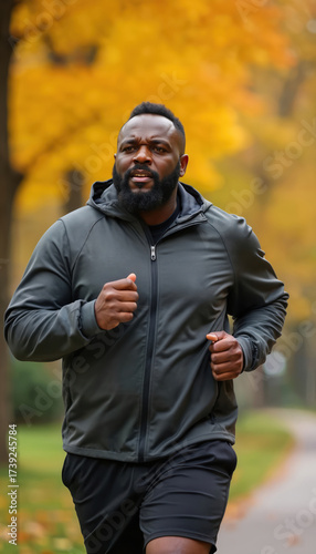 © miss irine, Obraz premium African American man jogging in autumn park. Overweight black man in sportswear runs on path. Man with beard and short hair doing cardio exercise outdoors.