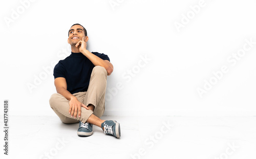 Fototapeta premium African American man sitting on the floor thinking an idea while looking up