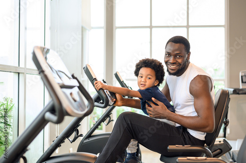 © bigy9950, Obraz premium African American man with child exercising on the exercise bike in indoor fitness club. Healthy and Fitness concept.