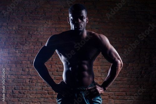 © yurakrasil, Fototapeta premium african american man with dumbbell weight training equipment gym