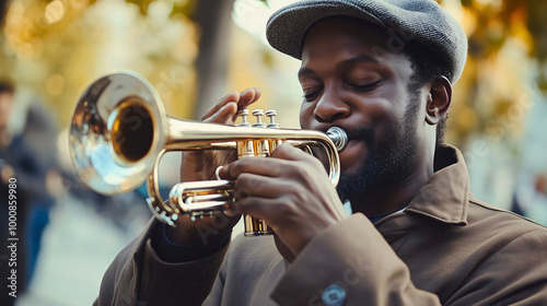 © Stefan, Obraz premium African American musician playing the trumpet, embodying the sound of jazz in a vibrant performance, showcasing musical talent as a male artist, classic music instrument
