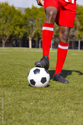 Fototapeta premium African American soccer player stands on soccer field with foot on ball