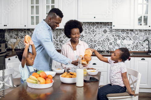 © sofiko14, Fototapeta premium African american wife and husband preparing tasty breakfast for their two cute daughters. Positive and beautiful family spending morning time together at home. Healthy nutrition.