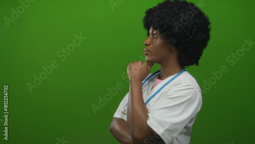 Fototapeta premium African american woman doctor holds stethoscope while hand on chin in green studio; serious contemplation.