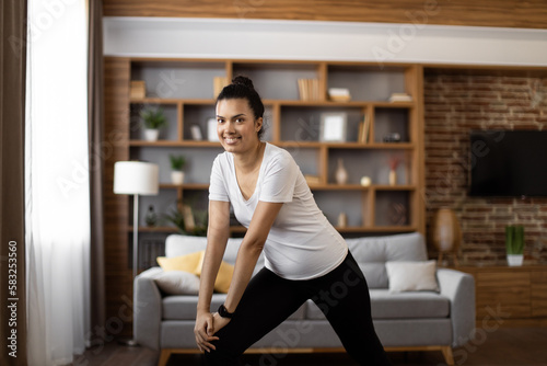 Fototapeta premium African american woman with dark hair stretching legs during workout at modern living room. Sporty female in activewear smiling and looking at camera while training during free time.