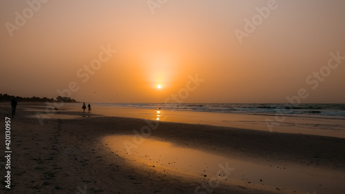 Naklejka premium African beach orange sunset. People / community get together at the evening time. Kotu beach, The Gambia