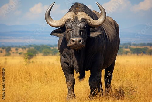© Andrii Yablonskyi, Obraz premium African buffalo in savanna, National Reserve created with Generative Ai