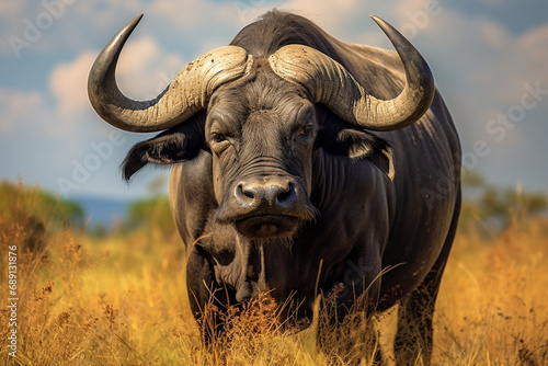 © Andrii Yablonskyi, Obraz premium African buffalo in savanna, National Reserve created with Generative Ai