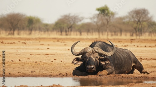Obraz premium African Buffalo Resting by Waterhole in Arid Landscape