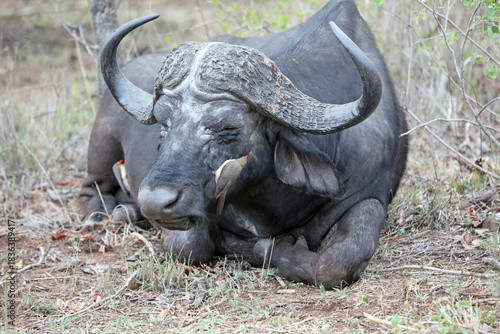 © Judith, Fototapeta premium African Buffalo with Oxpecker on its face, Sabi Sands, South Africa