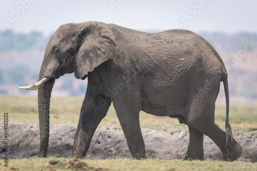 © Nick Dale, Obraz premium African bush elephant walks down grassy riverbank