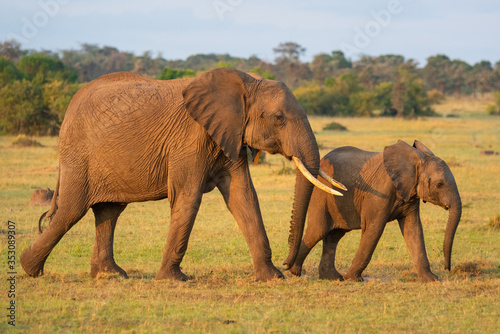Fototapeta premium African elephant and calf walk across savannah