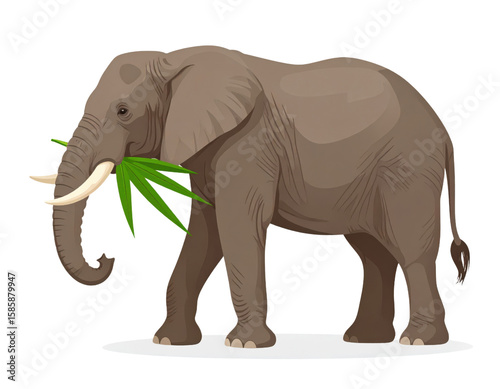 © AiMaball, Fototapeta premium African elephant eating green leaves with tusks and trunk in natural feeding pose