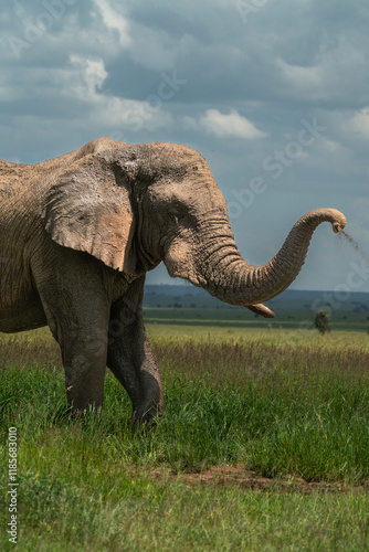 Obraz premium African elephant in the Serengeti throwing dirt on itself