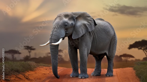 © Nemanja, Obraz premium African elephant standing on red dirt road at dusk with acacia trees