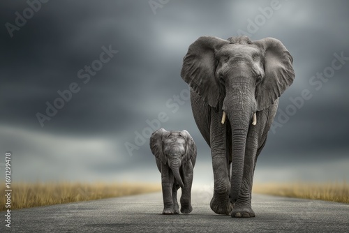 © Tecnology, Naklejka premium African elephants mother and calf on road