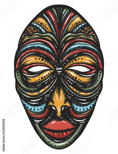 © intueri, Naklejka premium African ethnic mask. Africa elements. Old school tattoo vector art. Hand drawn graphic. Isolated on white. Traditional flash tattooing style