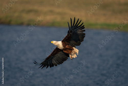 Obraz premium African fish eagle flies over calm river