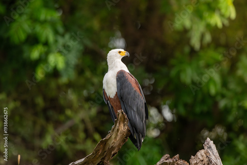 Obraz premium African fish eagle perched long the bank of the Chobe River.