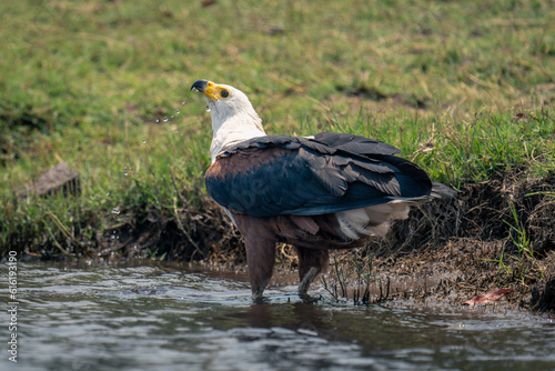Obraz premium African fish eagle stands in shallows drinking