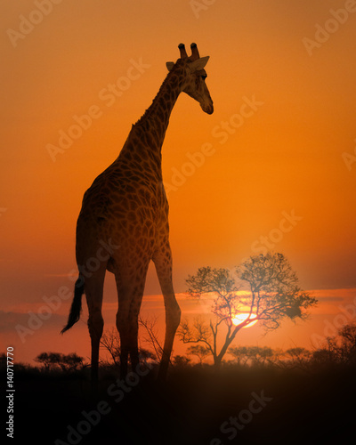 © adogslifephoto, Obraz premium African Giraffe Walking at Sunset