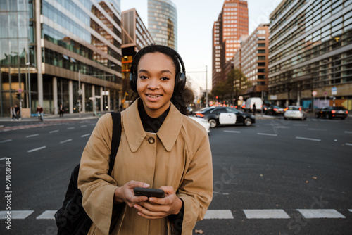Fototapeta premium African girl listening music with headphones and smartphone while walking outdoors