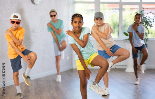 © JackF, Naklejka premium African girlie perform movements during warm-up, limbering-up part of workout with peers. Group of young girls and guys in ball cap and dark glasses dance in fitness club in background unfocused