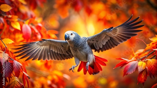 © Arnada, Fototapeta premium African Grey Parrot in Autumn Flight: Stunning Wildlife Photography