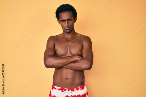© Krakenimages.com, Fototapeta premium African handsome man wearing swimsuit skeptic and nervous, disapproving expression on face with crossed arms. negative person.